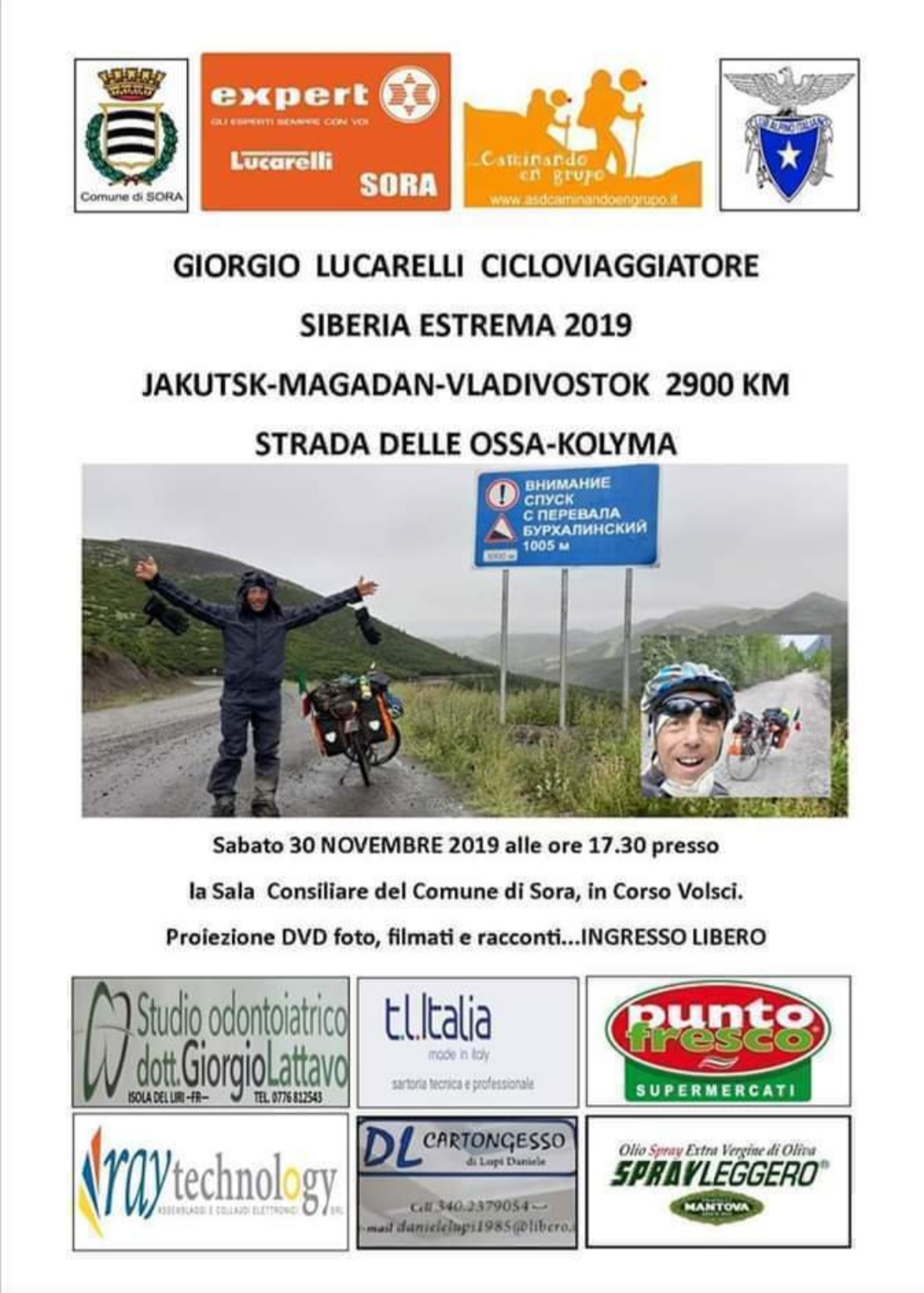 Sabato 30 Novembre alle ore 17:00 presso la sala consiliare del comune di Sora, ci sarà la proiezione del DVD con foto, filmati e racconti del cicloviaggio in Siberia da poco concluso.