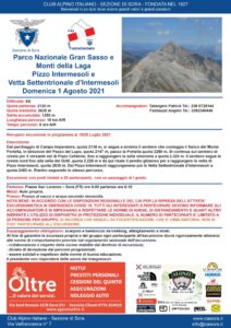 Per accordi presi tra gli accompagnatori, per domenica 1° agosto 2021 viene riproposta l’escursione a Pizzo Intermesoli vette Sud e Nord che fu annullata per le avverse condizioni meteo. Pertanto la prevista escursione “Anello di Monte Rotondo – Rif. Sebastiani”, verrà effettuata con data da destinarsi.