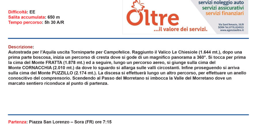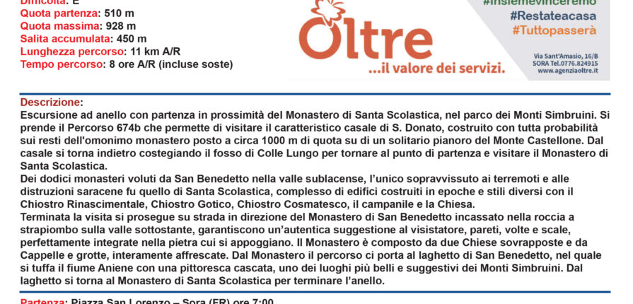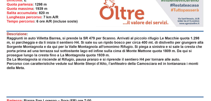 A seguito delle indicazioni della sede Centrale di Milano relative alle disposizioni anticovid, il programma escursionistico della sezione di Sora a partire dal 14 giugno è stato modificato con il seguente: data Luogo difficoltà Acc. 14/06/2020 Subiaco Monasteri Benedettini e giro ad anello Difficoltà: E Acc.: Cristini P. – Venditti A. 28/06/2020 Monte MATTONE – (PNALM) Difficoltà: E Acc.: Spassiani D. – Cristini P. 12/07/2020 Serra di ROCCA CHIARANO – (PNALM) Difficoltà: EE Acc.: Tatangelo P. – Venditti A. 26/07/2020 Monte FORCELLA da Pescasseroli – (PNALM) Difficoltà: E Acc. :