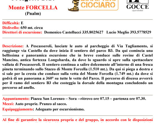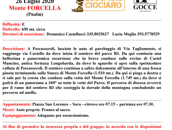 2020-07-26 M.te Forcella Di seguito troverete da visionare e scaricare: – il modulo di AUTODICHIARAZIONE OBBLIGATORIA che va riempito, da inviare o portare con se alla partenza dell’escursione da consegnare all’accompagnatore, tale documento dovrà restare in sezione (30 giorni) per eventuale tracciamento in caso di contagio; – il regolamento sulle modalità di partecipazione; N.B. Si richiede da parte vostra la PRENOTAZIONE contattando l’accompagnatore di turno segnalato sulla locandina. Certi di una vostra fattiva e necessaria collaborazione. Il presidente Domenico Spassiani Scarica le informazioni     —–>       Note Operative Partecipanti Scarica